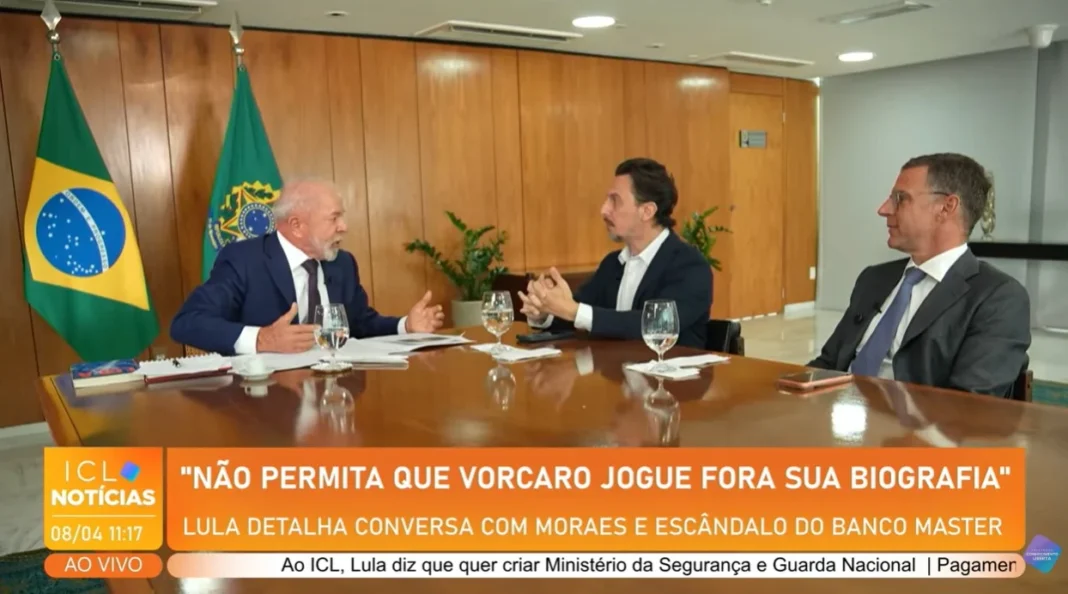 O presidente Luiz Inácio Lula da Silva relatou, em entrevista a Eduardo Moreira e Leandro Demori, no ICL Notícias — 1ª edição, nesta quarta-feira (8), uma conversa que teve com Alexandre de Moraes sobre o Caso Master e que aconselhou o ministro a se declarar impedido. Lula disse que o caso afeta a imagem do Supremo Tribunal Federal (STF).